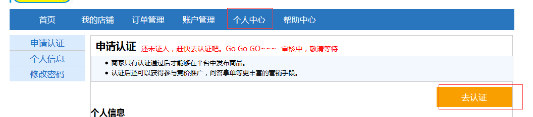 按照规定,注册成功后需要先进行信息认证,审核通过后才能发布商品